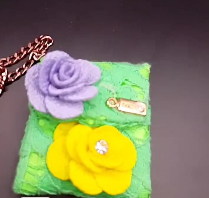 -flor de tecido lilas e 1amarela com pontinho de luz